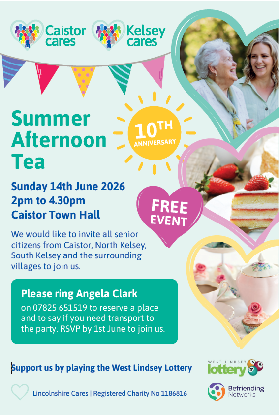 We would like to invite all senior citizens from Caistor, North Kelsey, South Kelsey and the surrounding villages to join us for our Summer Afternoon Tea, on Sunday 14th June 2026, 2pm to 4.30pm at Caistor Town Hall.